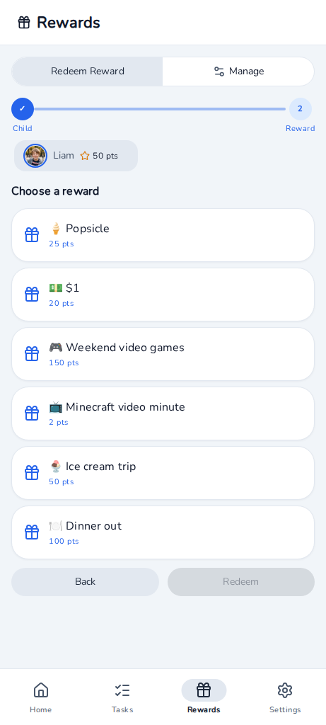 Kids redeem earned points for rewards you define — screen time, snacks, a trip to the park. You choose what motivates them.